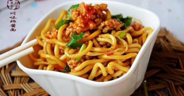 7、將煮好的面條瀝幹水分,放放入碗內,然後澆上炒好的雜醬。攪拌均勻即可食用。