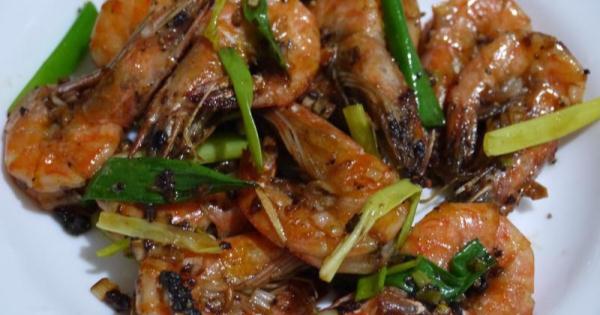 • 6爆香後,放入撈起備用的蝦,灑上適量的白胡椒粉、黑胡椒粒、鹽、醋,拌炒至蝦子全熟後,下青蔥段,就可以關火起鍋了。
