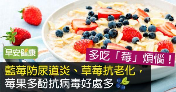 大家都知道莓果有著許多健康奇效,像是藍莓就有舒緩眼部疲勞、抗氧化與維持泌尿道健康的功效。草莓則富含可抗老的維生素C,而花青素更能活化腦部,多吃莓果好處多多!