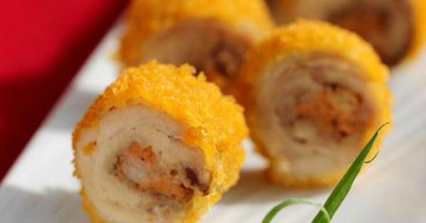 13. 先將蒸好的雞肉卷外面裹層澱粉, 放入雞蛋液中滾一下; 14.再放入面包糠上滾動, 讓面包糠均勻的粘在雞卷的表面; 15. 加熱油,油六、七成熱時放入雞卷去炸; 16. 炸至表面金黃後撈出放在紙巾上吸幹油份;