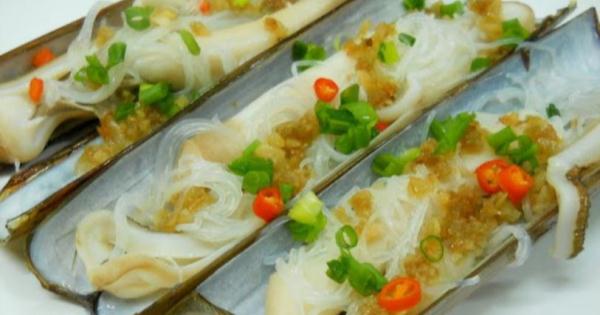 把冬粉鋪在打開的竹蚌,再把炒過的蒜茸鋪在冬粉上面,撒上紅辣椒,放在蒸籠上(水一定要滾),大火蒸4分鐘,蒸好後,馬上拿出來,撒上青蔥粒,趁熱吃。