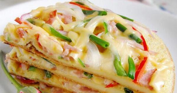 主料:雞蛋2個配料:培根一片、洋蔥1/4個、青椒1/2小個、紅椒1/2小個、早餐乳酪1片、面粉少許、香蔥一顆調料:鹽1/5茶勺