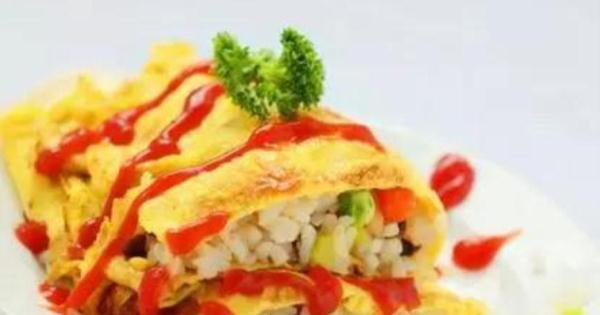11.熱油鍋,蛋液平緩且均勻的下鍋。12.雞蛋餅翻一個面。13.將炒飯放入蛋皮中間14.迅速蛋皮固定,盛入盤中,淋上蕃茄醬即可。