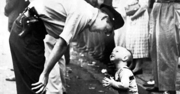 丹尼爾好奇地俯下身子,撫摸著小男孩的頭,