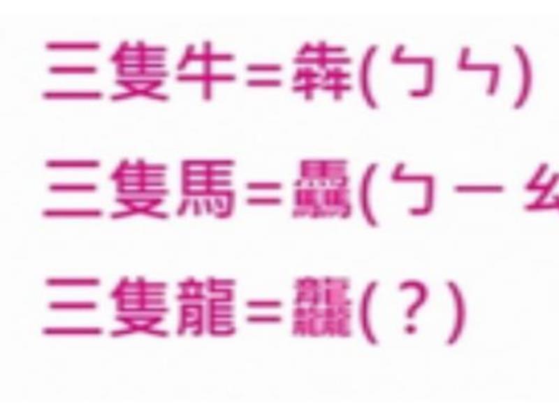 3.三馬為「驫」,讀作「飆」;字義為「馬奔馳貌」。
