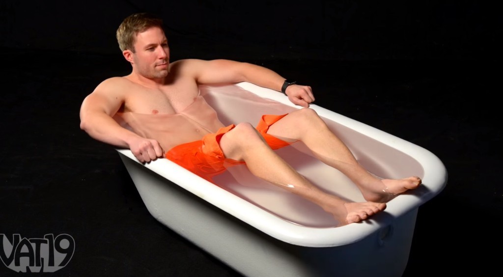 他將重達500磅 (約226公斤) 的液態玻璃黏土倒進浴缸裡頭,全身泡下去後他就開始後悔了…因為不但超重、而且又動彈不得啊!最後看到他辛苦爬出來的模樣、看起來真的有點悲劇…(而且還會黏腋毛)