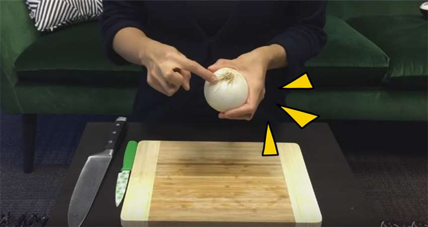 1、首先我們要找到洋蔥的「根」,因為連接根部的洋蔥心就是會讓你流眼淚的兇手!