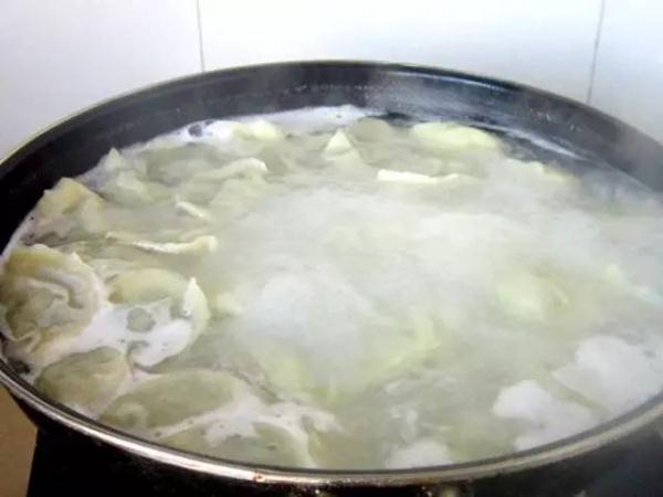 往鍋裡加入多點水,待水煮開後,放入少許油和鹽,從而使餃子皮更有韌度,然後再放入餃子。接著用筷子貼著鍋底來回攪動,這樣防止餃子不會全聚在一起。