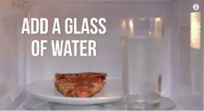吃不完的Pizza從冰箱拿出來微波前總是硬梆梆的,這時如果旁邊放上一杯水然後一起微波,Pizza就會變的更加鬆軟可口嚕!