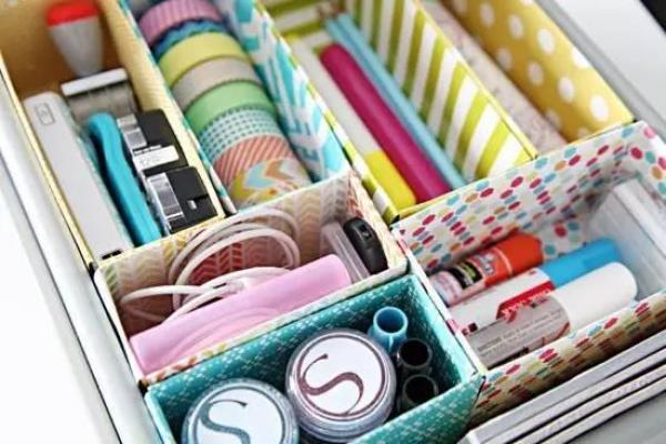 塑料儲物盒和抽屜裏面襯上好看的包裝紙,分類so easy!