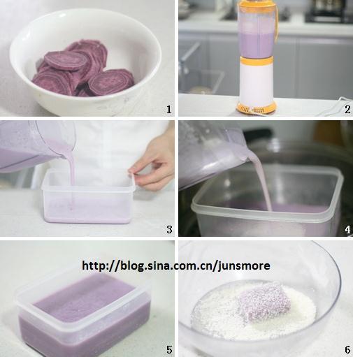 配料:紫薯(去皮後)150克,藕粉75克,粘米粉50克,小麥澱粉(或玉米澱粉)25克,細砂糖75克,牛奶210克,水210克,椰蓉適量(表面裝飾用)