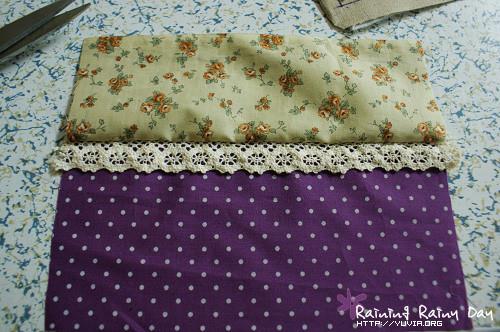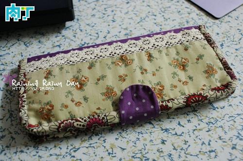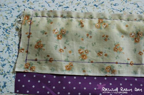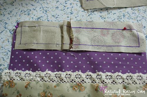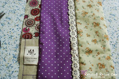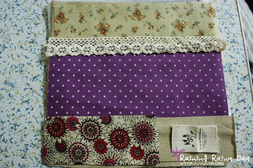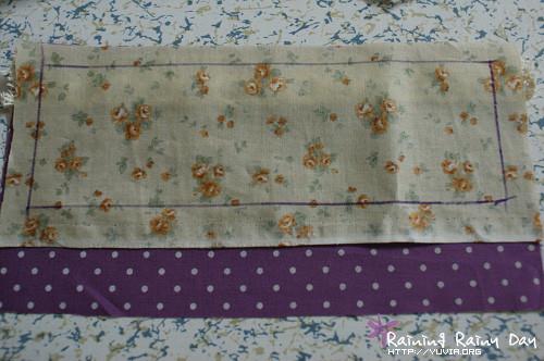 1、裡布19×18(同規格粘合襯、鋪棉各一)2、表布拚布1(紫色水玉)19×9、拚布2(黃底碎花布)19×6、拚布3(紫紅花布)11×3、拚布4(本色麻布)8×33、內層卡位1(紫紅花布10×19),內層卡位2(紫色水玉)12×19+14×9 (對折前尺寸),同規格粘合襯各一4、紙幣位(麻布水玉)16×19(對折前尺寸),同規格粘合襯各一5、零錢包(總尺寸14×19,對折前尺寸) 短布5×19,長布8×19,預留拉鍊寬度1cm,同規格粘合襯各一