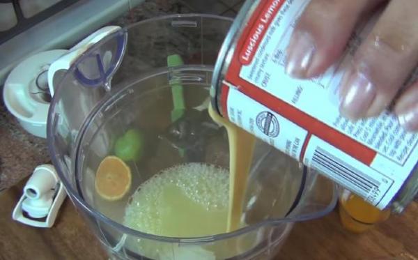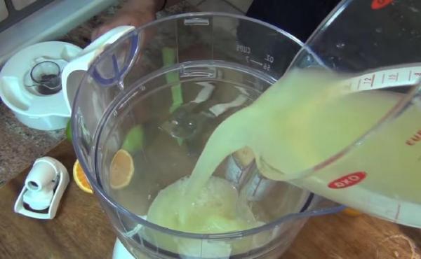 第一步,首先將事先榨好青檸檬汁倒入攪拌機中。