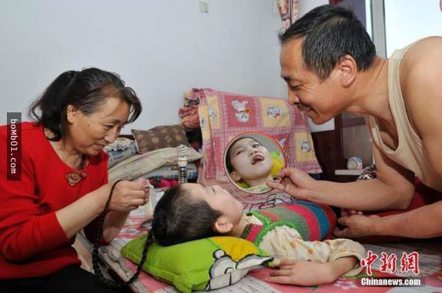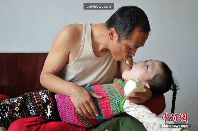 ▼這是拍攝於陝西夫婦家中的照片,照片中腦癱女兒的養父正在給她餵飯,這樣艱難的餵飯生活已經持續了15年。