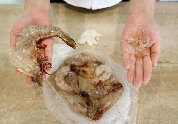 業內人士透露,一般冷凍蝦解凍後,蝦體會隨著水分流逝而變得又乾又輕,賣相不好。因此有些不肖業者會偷偷在蝦子裡注入明膠,讓蝦體變得飽滿有料,還能增加重量。