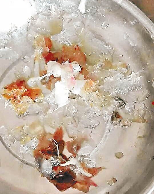 鄭小姐拿出蝦子準備好好料理一番時,發現蝦體浮現一坨坨不明的膠狀物質,才發現自己買到的蝦子被不肖業者注入了「明膠」。