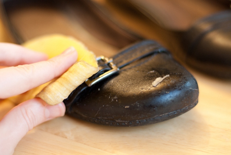 用香蕉皮的內側可以輕鬆幫鞋子打亮,用乾淨的抹布摩擦想要打亮的部位,就跟你平常打亮鞋子使用一樣的方式就可以了。