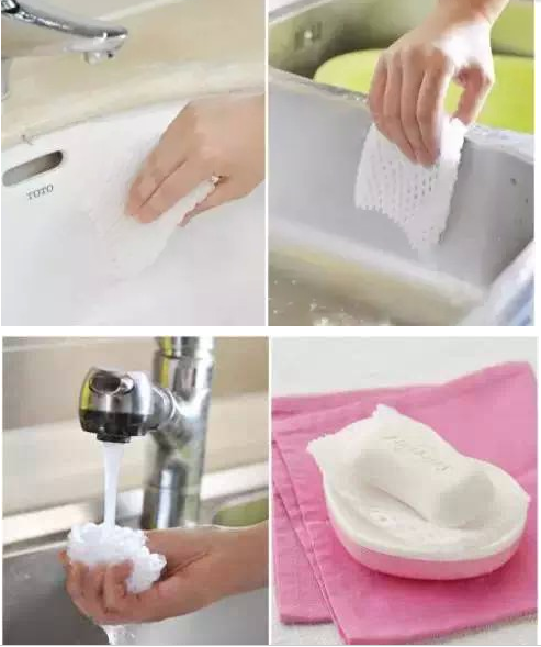 清潔洗手池 網格除了可以讓香皂變得乾爽,因為吸收了皂液,還可以直接用它來清洗家裡的水池,是個特好的幫手。據說,清洗不鏽鋼水池的效果,比清洗陶瓷水池的效果還要好哦。 擦過水池的網格,如果沒有破損,用清水沖淨,擠幹水分後,再次放入皂盒使用。