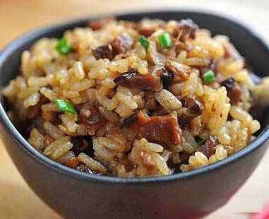 原料:臘腸1根,小蔥適量,香菇,米飯一碗,生薑,生抽,老抽,糖,酒,油