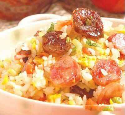 3、熱鍋燒油,放入蔥花炒雞蛋,再放入米飯翻炒。4、最後放入培根翻炒,加入適量鹽翻炒出鍋