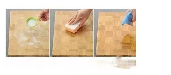 將食用醋倒一些在菜板上,用乾淨的抹佈在上面擦試幾次,然後用清水沖洗乾淨,放在通風乾燥處晾乾就可以了。
