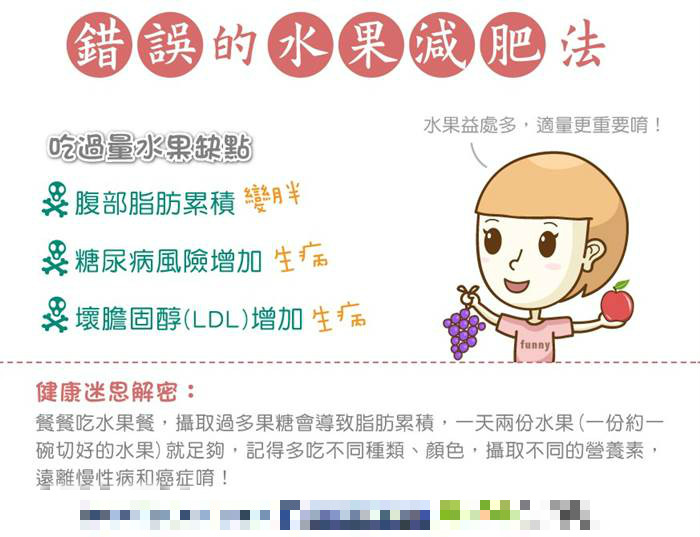 飲食均衡才是健康的秘訣!雖然水果含有豐富的膳食纖維及維生素,但同時也含有大量的糖份。再好的東西吃太多也是會對人體造成負擔。當大家都把矛頭指向含糖飲料和甜點添加的過量果糖時,記得回頭看看,自己是否也是吃著不適量水果呢?