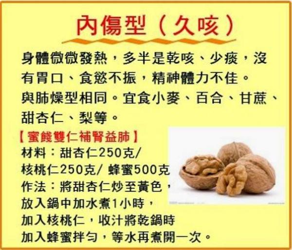 內傷咳嗽多為久咳、反復發作的 咳嗽,這時應注意給孩子吃一些調理脾胃、補腎、補肺氣的食物,具體方法如下: