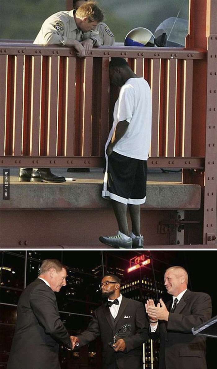 ▼1. 警察勸說想要自殺的人積極面對生活,8年後他成為了兩個孩子的父親,並在自殺基金會給那位警察頒獎。