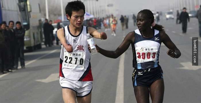 ▼14. 馬拉松比賽時,女選手不顧成績,配合地拿著水給沒有雙手的參賽者喝。