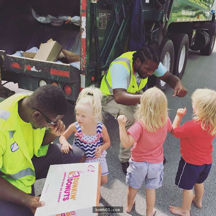 ▼15. 三胞胎女孩將水和食物遞給垃圾清理人員,他們是最好的朋友。