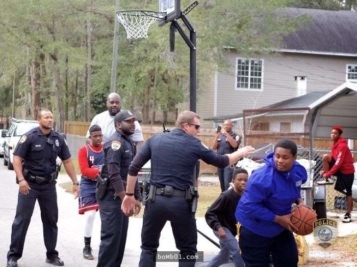 ▼19. 接到無理鄰居投訴稱孩子們玩鬧聲音太吵後,警察和籃球巨星現身和他們打籃球。