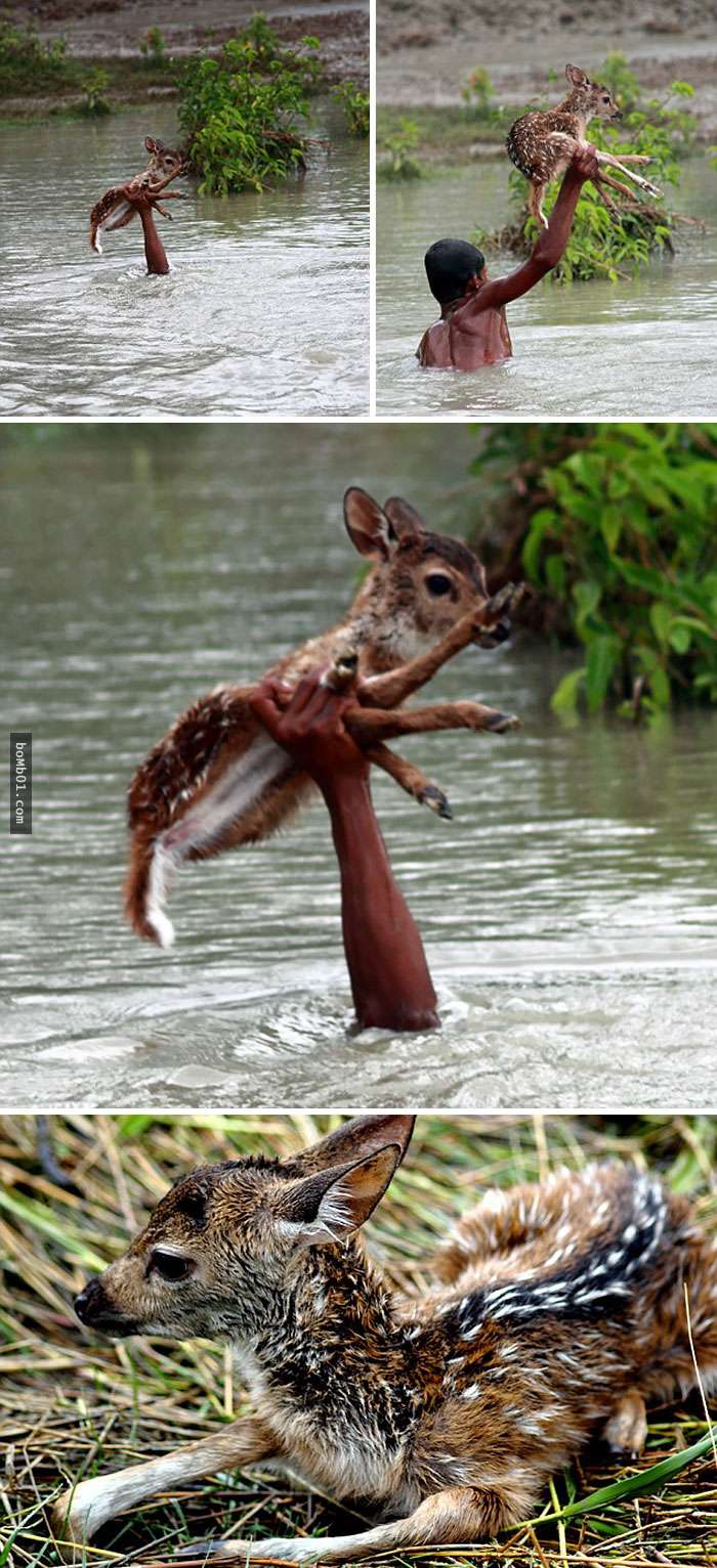 ▼2. 小男孩冒著生命危險跳進洪水中拯救溺水的小鹿。