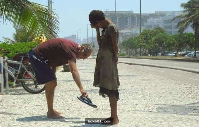▼3. 巴西裏約熱內盧,一位男子將鞋子給無家可歸的女孩穿。