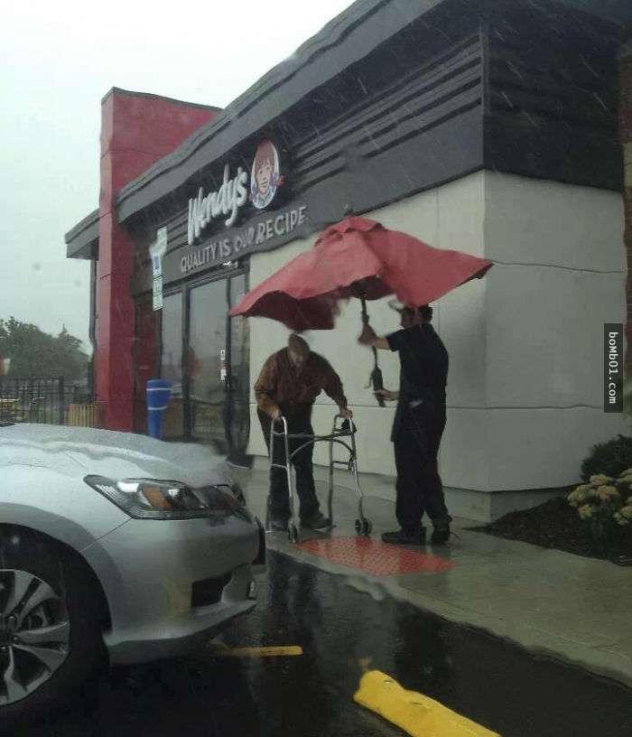 ▼6. 這位員工將露天座位上的傘拆下來幫老人遮雨。