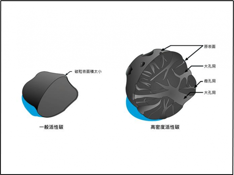 二.高密度活性碳:很多濾水器的材料都使用這的原因則是可以比一般活性碳擁有更多孔洞,能增加過濾的效果和速度,更可以阻隔小至0.2微米、比人類的頭髮直徑小200-300倍的微粒