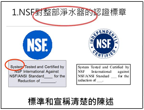 每家淨水器廠商當然都會說自己的商品有多好多棒,除了可以看設備的優缺點之外,還可以靠認證替我們把關,而水質認證的專家非NSF莫屬,NSF也就是美國國家衛生基金會,而這個基金會為一非政府組織/非營利組織(NGO/NPO),針對食物、水以及環境等領域。