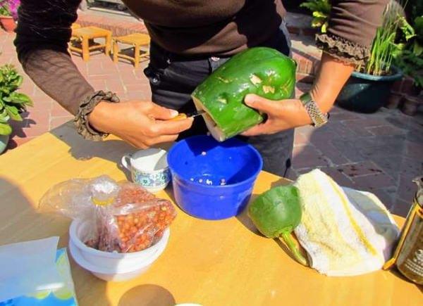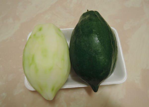 劉村長說,青木瓜最好選擇果實肥短,容量比較大,將木瓜頂部切開,挖出木瓜內的種籽,再開一個小缺口方便倒茶水,8 F一邊開個小洞透氣,放入茶葉、倒進沸水後蓋回木瓜頂部,並以牙簽固定,泡茶過程和一般茶葉相同。