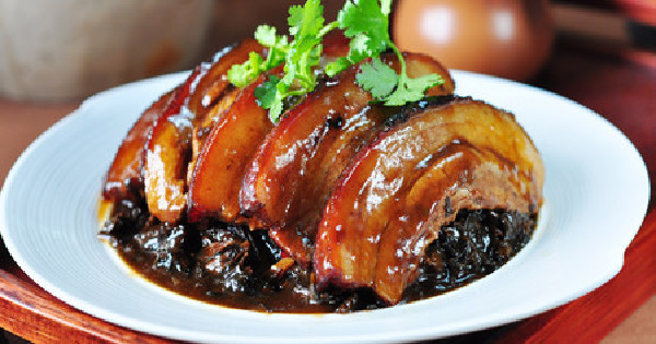 8)鋪上炒好的梅乾菜,上鍋蒸或者砂鍋煨2小時,高壓鍋更好,省事。9)濾掉湯汁在另一個碗裏備用,梅菜扣肉倒扣在盤子裏,剩餘的湯汁勾芡,放點味精提味後澆在肉上即可。