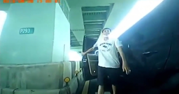 剛開始從轎車上下來的男子態度囂張,看到重機騎士壯碩的體型後,卻立刻變成了另外一副模樣。