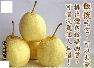 韓國研究人員發現,飯後吃個梨或喝杯熱梨汁,積存在人體內的致癌物質可以大量排出。調查結果顯示,吸煙或者吃烤