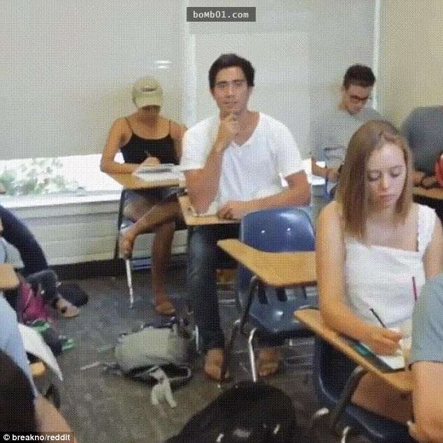 他將真人大小的照片放到桌子上,自己躲在後面睡覺。因為照片的背景與教室契合,看起來就像他在聽課一樣。看完這段影片後,網友們紛紛表示學會了上課偷懶的新方法,不過也有人認為影片是合成的,並不真實。分享出去,讓大家都看到他上課偷懶的新技巧吧。