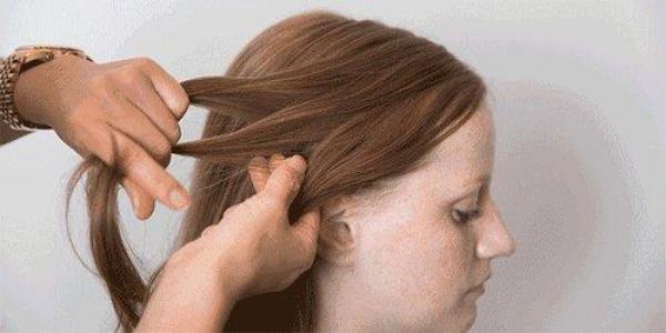 如圖所示:頭髮分上下兩部分,上半部分先四股編髮,編完了和下半部分頭髮合併再紮好就行了。