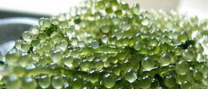 後來才知道原來這是一種水藻。 因為酷似一串串晶瑩剔透的葡萄而得名。它獨特的外形與口感像極了鮭魚卵,咬起來會有卟滋卟滋的聲音,美麗的綠色小顆粒散發出海味的鹹鮮芳香,頗有魚子醬的神韻,所以被譽為植物中的「綠色魚子醬」。