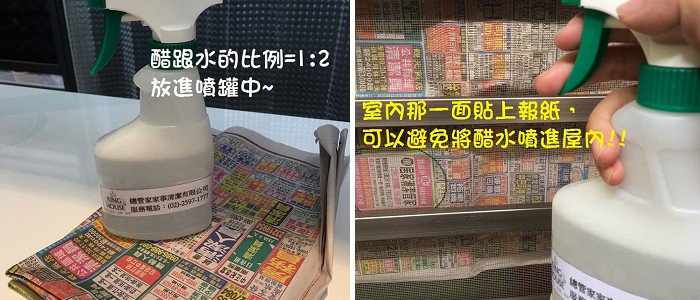 將醋跟水用1:2的比例調製好後,噴灑在紗窗、門上,醋的抗菌和消毒作用,會讓蒼蠅不敢靠近。要怎麼噴灑呢?先在室內那一側的紗窗、門貼上報紙,再從外側噴灑醋水,除了可以噴得均勻,撕下來的報紙還可以拿來擦玻璃,一舉兩得不浪費喔!
