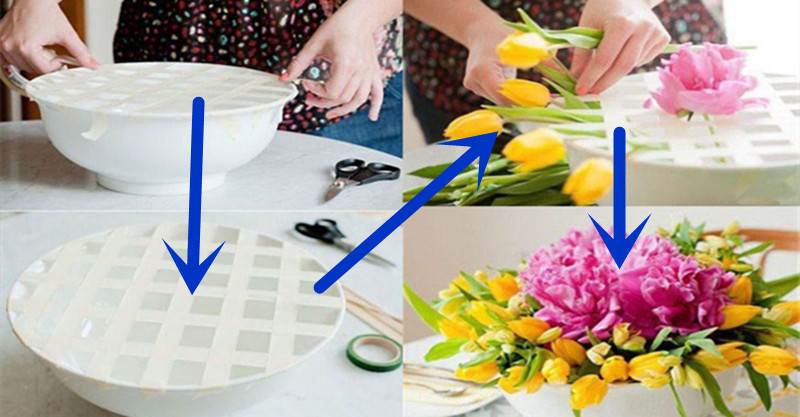準備一個大碗,放上水,用白色的膠帶,貼成這樣的小格子,方便插入每一個小格子插入一兩朵鮮花。注意,一定要貼穩,以避免布置好的鮮花變得散亂。