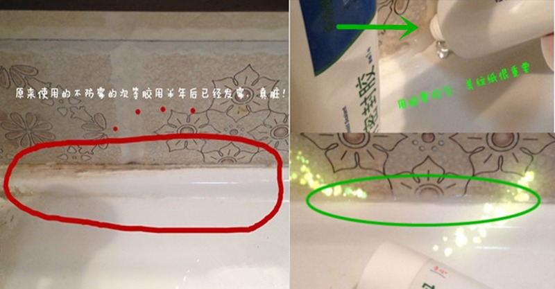 4、擠入縫隙內魯矽家用密封膠,用刀等有平整麵的工具刮平,靜置12個小時就OK了,以後再也不會發黑髮黴了。(一定要靜置時間足夠長,才能達到預期的效果)