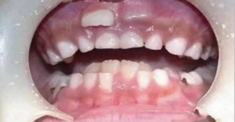 由於舊的乳牙沒有及時脫落,下牙齒中間長出的兩顆新牙被擠成倒八字的形狀生長,中間還產生了半個牙的空隙,乍看上去就像兩排異形的牙,就是「雙排牙」!