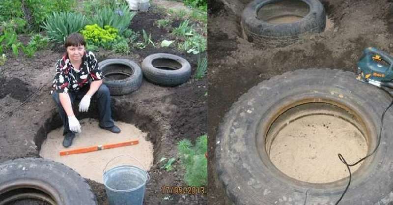首先,琳達先在院子裏挖出幾個能容納輪胎大小的坑,然後在底部倒入一些沙子作為鋪墊。