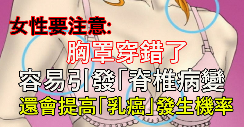 但很多人並不知道,胸罩穿不對還會傷頸椎。胸罩帶過緊可壓迫頸部肌肉、血管、神經,使其受累,可誘發頸椎病,產生上肢麻木、頸 部痠痛、頭暈、噁心等症 狀。長期如此,會導致肩、背局部肌肉,如背闊肌、胸鎖乳突肌呈不同程度的老化,X光檢查則表現為頸椎肥大性改變。