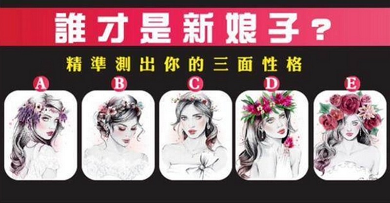 | 在這個性格測驗中,你的狀況選擇將透露出你較容易給人的印象,另外也會間接顯示你的社交力、異性緣、敏感度。一起來看看解析的結果吧! 【測試題目】根據圖片,你認為誰才是真正的新娘子?